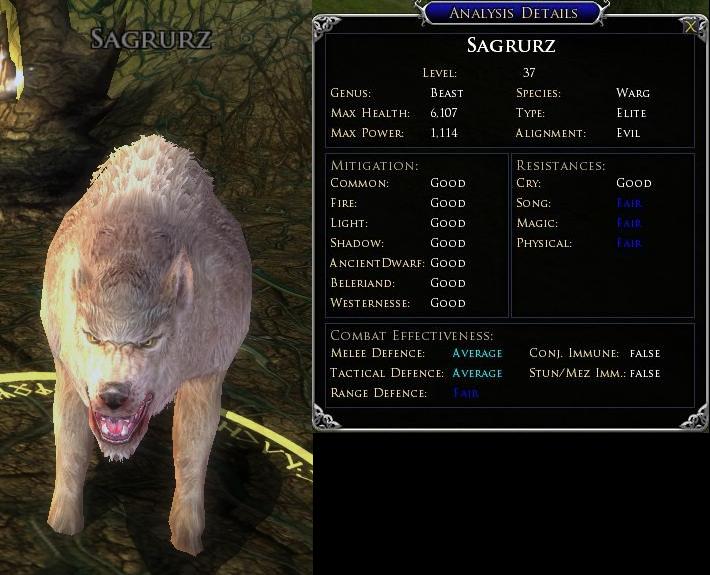 | Hinweis | PH is a Ravenous Twilight-Howler that roams up the hill and back through the camp. There is another named Warg which spawns slightly to the west of Sagrurz's spawn point and is NOT a PH so ignore it. Es gibt 2 Platzhalter für diesen Gegner. 1. „Wanderer“: Gefrässiger Dämmerheuler (4.2S, 65.2W) 2. „statischer“ Gegner: Gefrässiger Dämmerheuler (4.2S, 65.2W) |